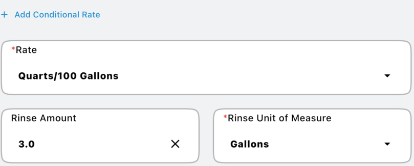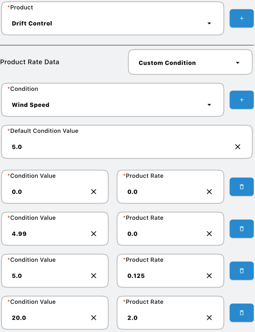 The example of a custom condition rate uses a Drift Control for a product. We want to reference the Wind Speed for the condition which is in MPH for units. We do not want to add any drift control product until the wind speed is at 5 mph. Then between 5 and 20 mph wind we want to linearly increase the drift control to a maximum rate of 2 quarts per 100 gallons.
