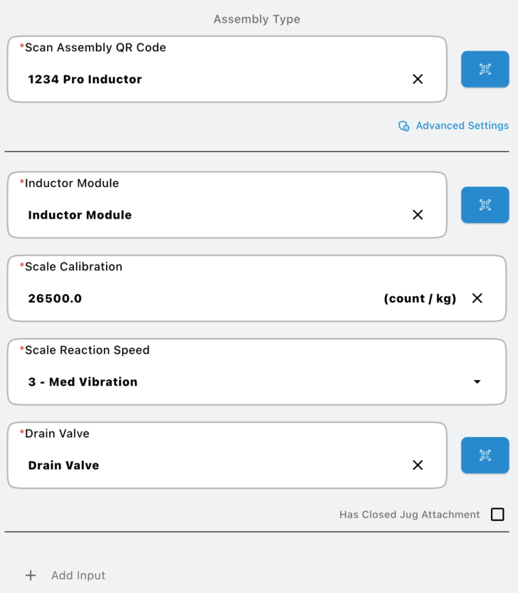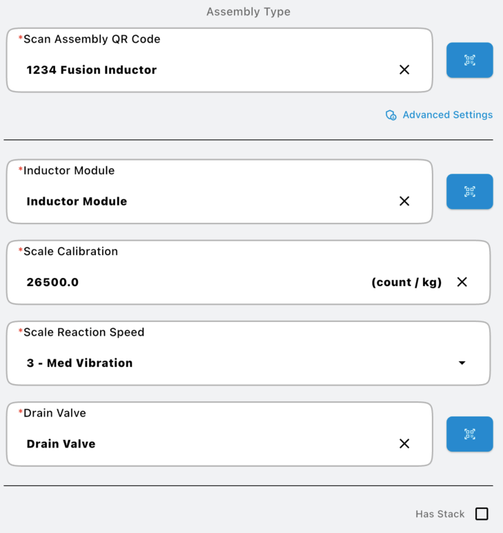 3. When manually entering information, first select the type. The types of assemblies are: Pro Inductor, Fusion Inductor, Stack Stand, and Carrier. Second, enter the serial number for the assembly. Carrier does not have an assembly serial number and a machine can only contain one carrier assembly.