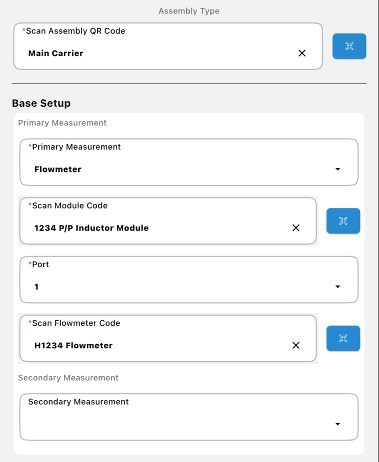 The secondary measurement section defines the flowmeter used to measure the rinse water when the physical plumbing layout requires a separate flowmeter. The information needed to complete this section is the same steps that are needed for the primary measurement section.