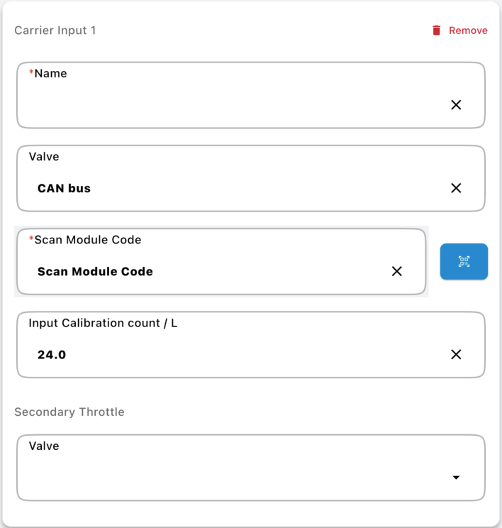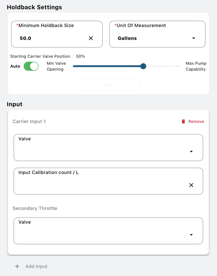 The carrier inputs define the valve to control the flow of that carrier product into the mix. They optionally can set the calibration to be used with this input as well as if there is a secondary control valve to allow a bypass of the product to be sent into the mix.