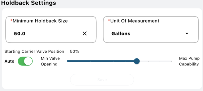 The Holdback Settings allow for a change to the holdback size or the Starting Carrier valve position and whether or not the Mixmate can automatically adjust the carrier valve position for best system performance. If you have a high percentage of carrier, the Starting Carrier Valve Position can also be larger. Likewise, a smaller percentage of carrier warrants a smaller Starting Carrier Valve Position. ** NOTE ** If you change any setting here, you MUST press SAVE for the changes to apply.