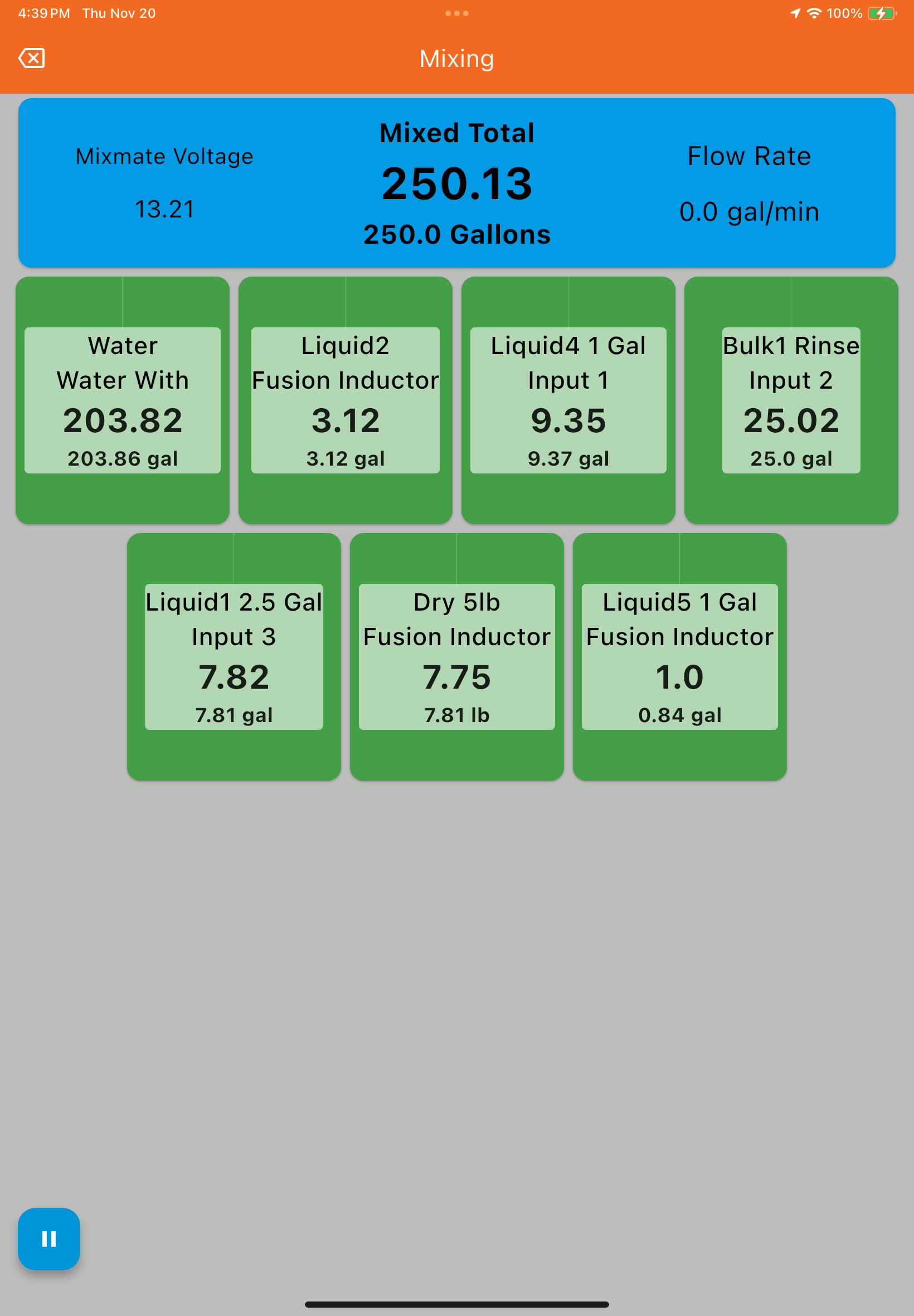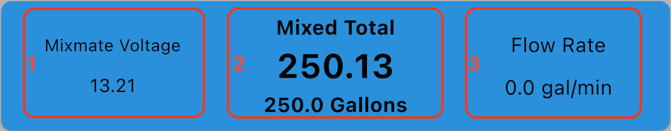The mix status card gives you information such as the Mixmate voltage, the mixed total, the overall mix flowrate.