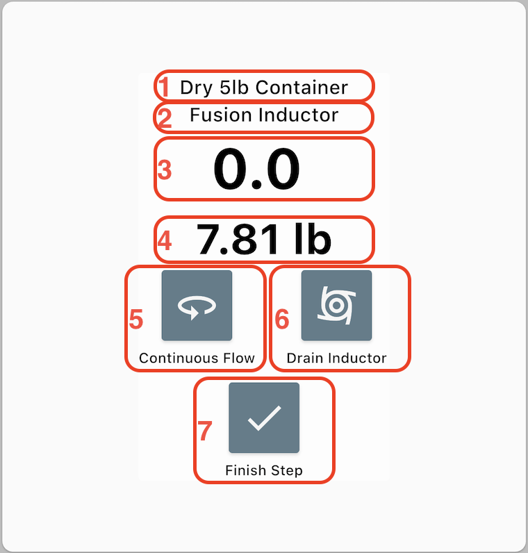 7. The finish step button is used when you are done adding this product to the mix. When you have a Pro Inductor, closing the lid is the same as pressing the finish step button. If the product has not reached the target amount and you have saved this mix for recovery, you will have the opportunity to add more of this product to the mix.