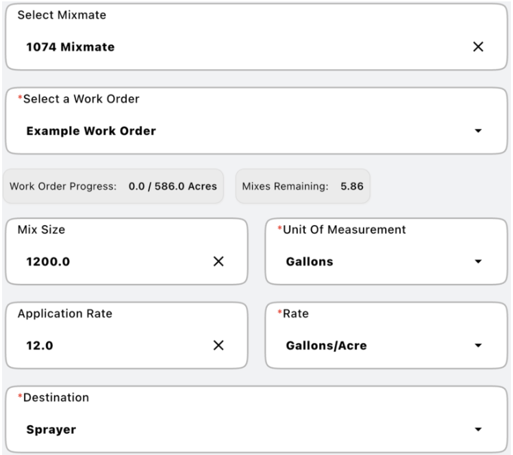 If your Work Order is based on an application rate (e.g., 10 Gallons per Acre), you can adjust that rate here. This automatically recalculates the amount of chemical needed for the mix size you chose.