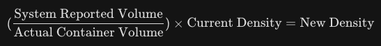 If you notice a consistent discrepancy—for example, a 2.5-gallon container is empty but the system reports only 2.42 gallons were poured—you can calibrate the density using this formula:
