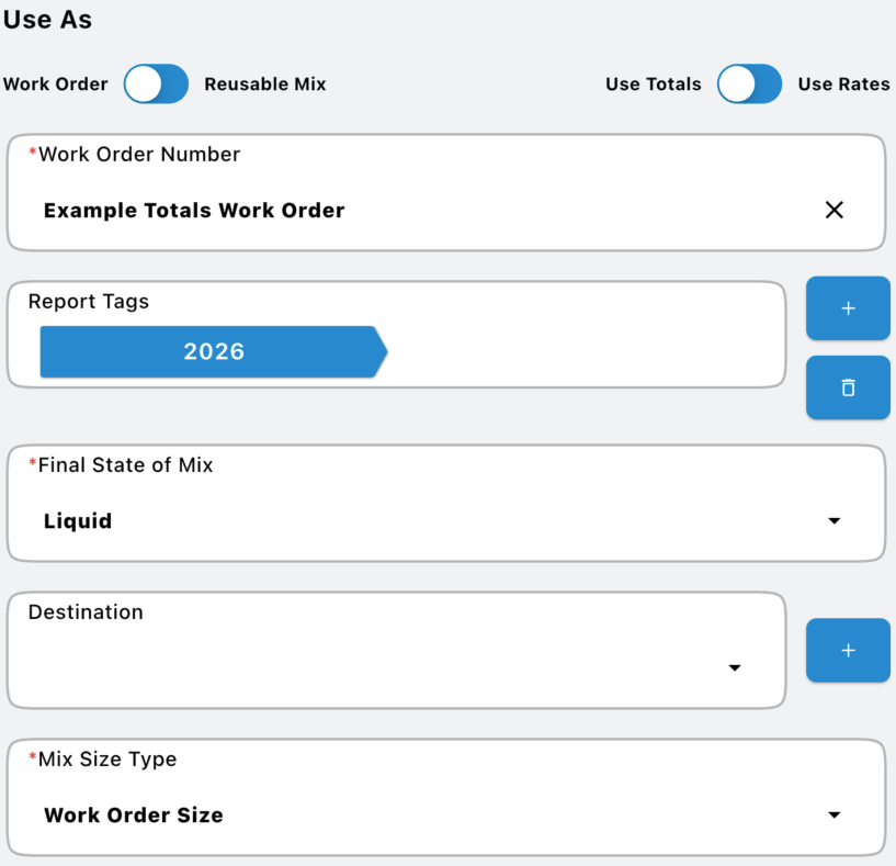 The mix size type sets the size of each mix independently of the work order size. Below are the options and how it divides the work order into individual mixes.